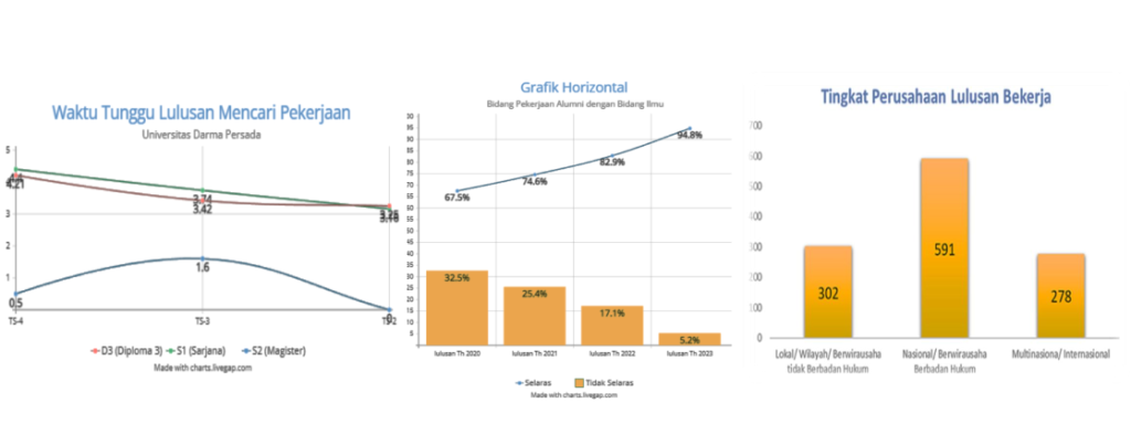 Grafik tingkat kesesuaian kerja membuktikan bahwa lulusan Universitas Darma Persada bekerja sesuai atau selaras dengan program studi meningkat dari tahun 2020 hingga 2023.